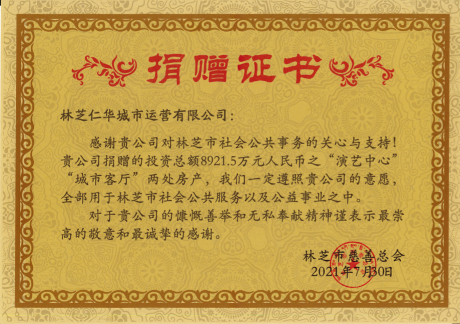 2021年7月30日下午,仁和集團下屬林芝項目單位——林芝仁華城市運營有限公司與林芝市慈善總會正式舉行捐贈簽約儀式,將投資總額約8921.5萬元、建筑總面積11640.37平方米的自建房產(chǎn)工布天街項目中的“演藝中心”“城市客廳”無償捐贈與林芝市慈善總會,用于林芝市發(fā)展社會公共服務以及公益事業(yè)。善心善舉,彰顯了仁和強烈的社會擔當。